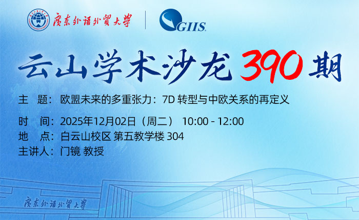 12月2日,我院成功举办云山学术沙龙第390期,讲座由华东师范大学欧洲研究中心主任、让·莫内讲席教授门镜主讲,主题为“欧洲未来的多重张力7D转型与中欧关系的再定义”。我院硕博士学生共同参与。本次讲座由我院云山领军学者李形教授主持。门镜教授在讲座中提出了“7D转型”框架,系统分析了欧洲当前面临的多重结构性挑战。她指出,欧盟正同时应对债务(Debt)、脱碳(Decarbonization)、防务(Defense)、民主(Democracy)...
