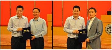 Zhong Weihe presented the agreements of appointment to Song Ronghua and Zhang Weidong as guest researchers of GRIIS.