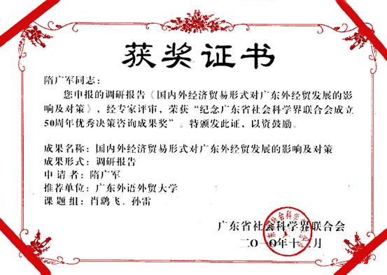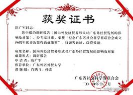 ● In December 2010, Professor Sui Guangjun published the Influence of Domestic and International Trade on the Trade Development of Guangdong Province, which won the Excellent Decision-making Award of the 50th Anniversary of Guangdong Social Sciences Association.