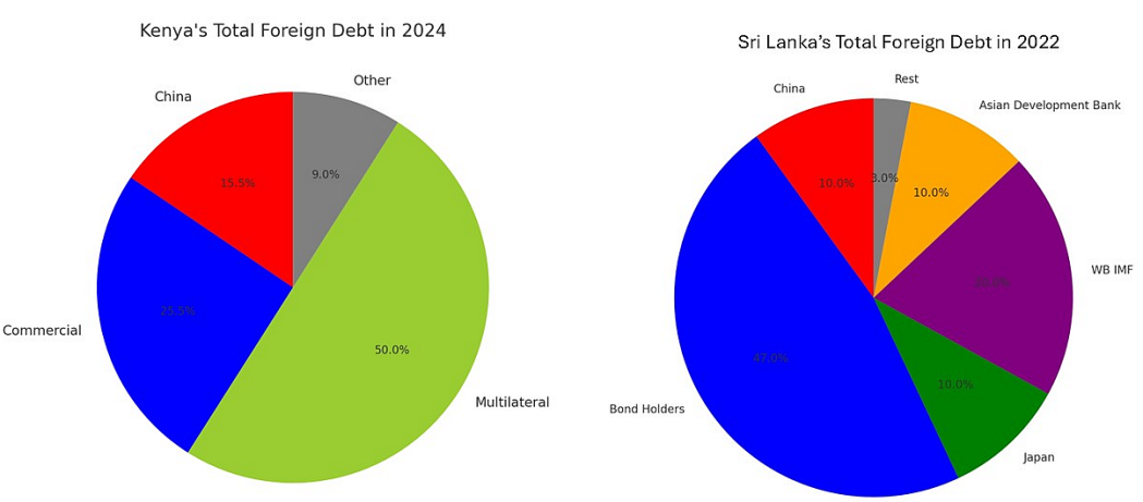 What is meant by "composition" is how much of a country's total foreign debt is owed to various creditors, expressed as percentages [see Figure 1]. We immediately discovered that the portion owed to China represents only a fraction of the total debt (10% in Sri Lanka's case in 2022 and 15.5% in Kenya's case in 2024).