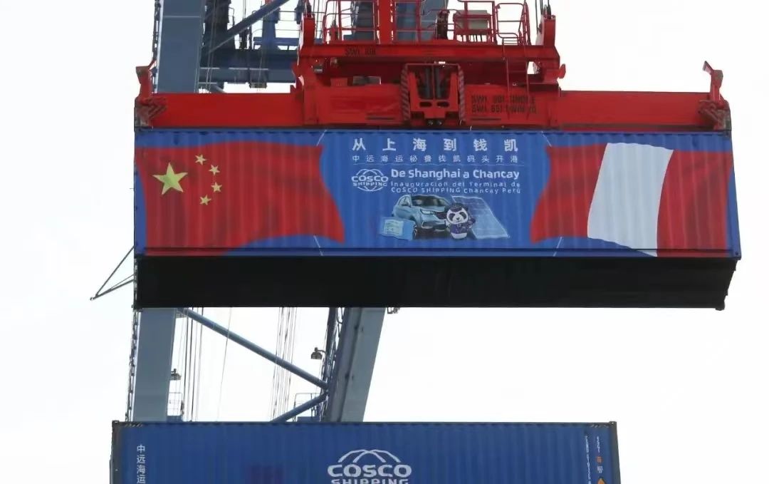 ▲A container is lifted at Chancay Port in Peru, on Nov. 14, 2024. [Photo by Li Mengxin/Xinhua]