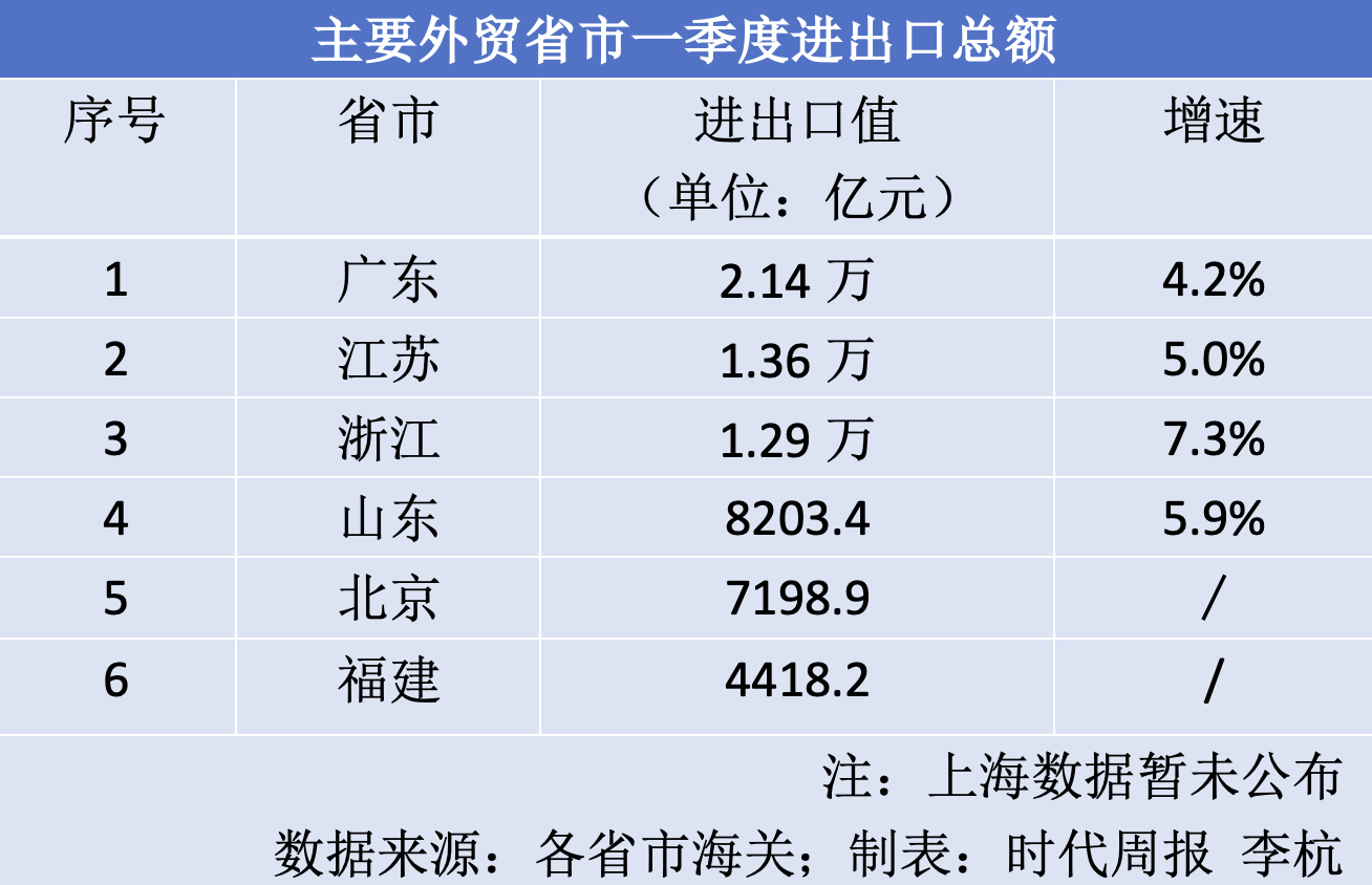 在已公布数据的6个省市中,广东以2.14万亿元的进出口总额居首位,持续发挥外贸大省引领作用;浙江实现7.3%的同比增速,对全国增长贡献率达66.4%,居全国首位;江苏的一季度出口额高达到9049.9亿元,增长9.6%,为全国货物贸易进出口累计增速由负转正提供了支撑。