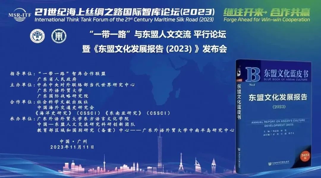 11月11日,21世纪海上丝绸之路国际智库论坛(2023)于广州举行。本届论坛由“一带一路”智库合作联盟、广东省人民政府指导,中共中央对外联络部当代世界研究中心、广东外语外贸大学和广东国际战略研究院联合主办。论坛主题为“继往开来合作共赢”,“一带一路”共建国家的智库领袖、知名学者、政府官员、企业家、驻穗总领事、驻穗商会等参加。《东盟文化发展报告(2023)》在该国际智库论坛——“一带一路与东盟人文交流”平行论坛发布。