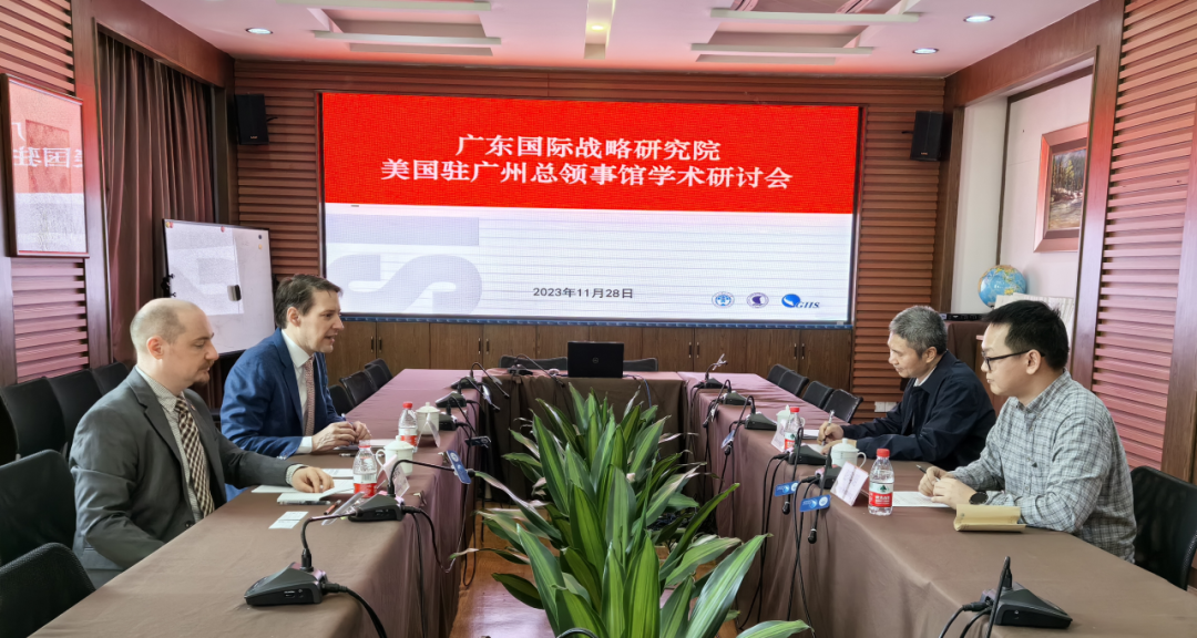 11月28日下午,美国驻广州总领事馆经济政治部主任冯海博(EricFrater)和对外联络官员吴景安(GeoffreyWessel)来访广东国际战略研究院。副院长周方银教授、外事秘书彭科明出席座谈交流。