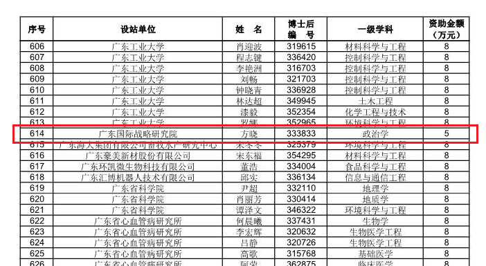 据悉,本次获得中国博士后面上项目资助的博士后有3914名,资助对象偏重理工基础科学学科类研究,政治学学科全国仅有16人获得资助,占总数的0.4%,此次我院方晓博士后上榜更显难能可贵。近年来,我院瞄准国家和区域战略需求,抢抓国家推进“双一流”建设、广东省实施“冲补强”提升计划的契机,不断创新工作思路,加强学科建设,提高人才培养质量,提升科研攻关能力,助力博士后开展高水平科学研究,为国家和广东省经济社会发展提供更加坚实的人才支撑。