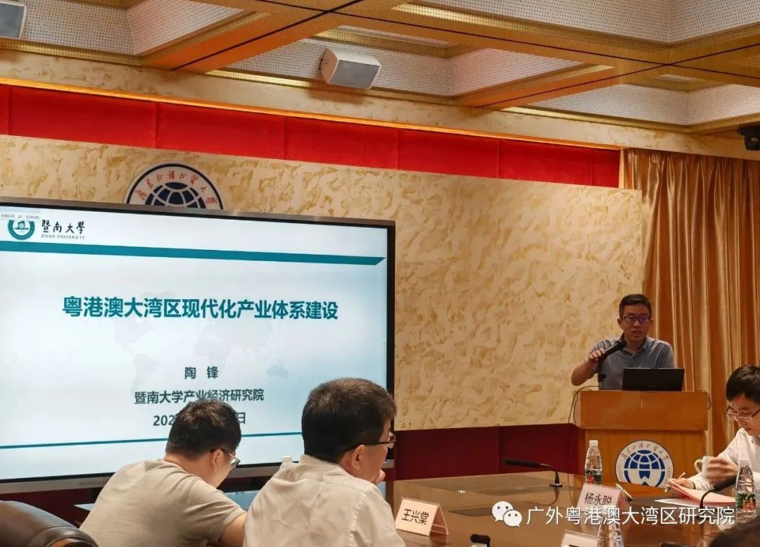 暨南大学产业经济研究院院长陶锋分享了关于粤港澳大湾区现代化体系的建设,他指出当前产业体系存在一些比较明显的问题,比如低水平循环锁定,产业进步主要表现为量的规模扩张而非质的提升等。他强调,要解决上述问题,关键在于以制造业高端发展为核心,以三次产业融合发展为动力,重视数字经济与实体经济融合发展,中间产品配套体系扩容提质等,综合带动牵引城市之间的融合和发展。