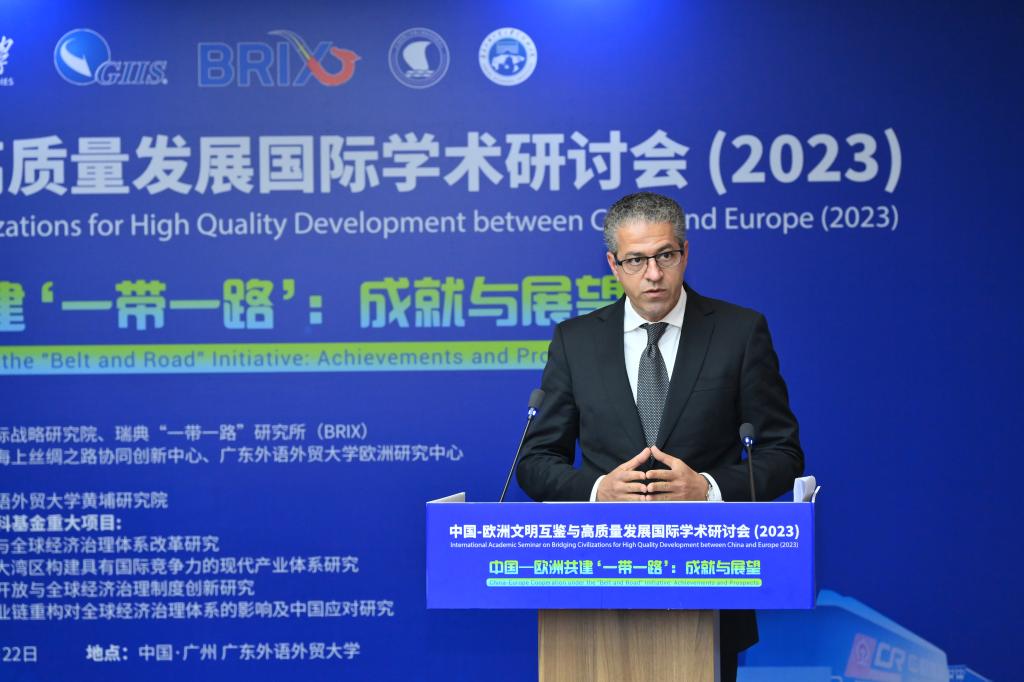 10月22日,中国-欧洲文明互鉴与高质量发展国际学术研讨会在广州顺利召开。本次会议以“中国-欧洲共建‘一带一路’:成就与展望”为主题,由广东国际战略研究院、瑞典“一带一路”研究院、21世纪海上丝绸之路协同创新中心和广东外语外贸大学欧洲研究中心联合主办,由广东外语外贸大学黄埔研究院承办。与会人士围绕共建“一带一路”倡议提出十周年来所取得的巨大成就、国际贡献及未来展望展开了热烈讨论,并从政治、经济、社会人文等不同角度为中欧进一步深化文明交流与合作提出了积极建议。