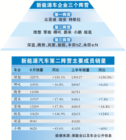 在第二阵营中,2月和3月销量前三是理想、蔚来、哪吒,4月变成了理想、哪吒和腾势,5月和6月则是理想、零跑和哪吒。排名变化的原因在于,第二阵营的车企基本都只能在某一个价位或一个细分市场“钻研”,几乎没有“六边形战士”(全能选手),因此抗风险能力相对较低。