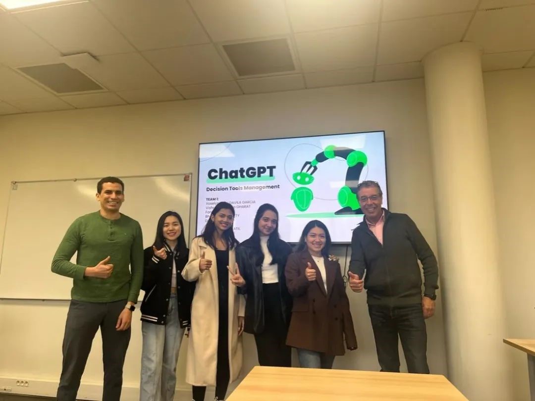 郑丹妮同学(左2)在法国雷恩商学院与同学做课堂展示
