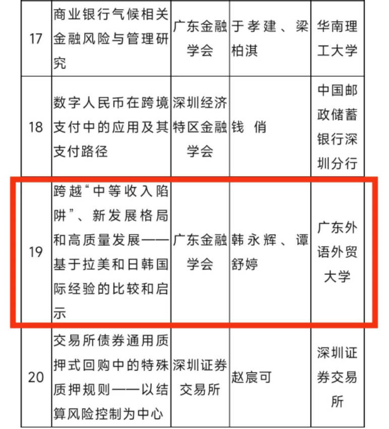 我院珠江学者韩永辉发表的论文《跨越“中等收入陷阱”、新发展格局和高质量发展——基于拉美和日韩国际经验的比较和启示》荣获第十二届广东省优秀金融科研成果论文类三等奖。