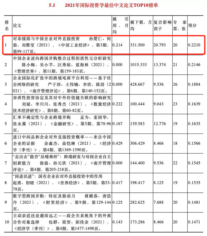 近日,我院高级研究员陈伟光教授撰写的论文《共建“一带一路”:一个基于制度分析的理论框架》入选“2021年全球治理学最佳中文论文TOP10榜单”,我院孙楚仁教授与西南财经大学国际商学院硕士研究生何茹、博士研究生刘雅莹合作撰写的论文《对非援助与中国企业对外直接投资》入选“2021投资学最佳中文论文TOP10榜单”。