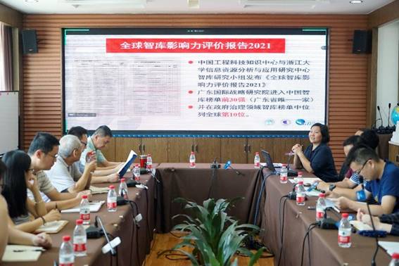 李青教授首先对研究院暑期工作作了专题总结报告。过去的两个月间,研究院在最新发布的《全球智库影响力评价报告2021》中进入全国前30强,成为广东唯一一家上榜的智库。“全球治理与人类命运共同体建设重点实验室”和“全球产业链大数据重点实验室”获批广东省社科重点实验室。“欧亚校园”计划、海外名师项目、知识城校园规划等工作稳步推进,暑期“三下乡”企业调研及中小微企业调研案例大赛顺利开展。就2022年下半年工作计划,她强调要继续加强理论学习,促进党建工作;加强全球经济治理学科建设,以人才培养作为工作重心;扎实提高决策咨询报告质量,立足研究领域提升服务水平;产出高水平研究成果,推进品牌著作出版;加强国际交流合作,筹办国际会议论坛;大力推进重点实验室建设,提高刊物的学术影响力;扩大研究院的社会影响力,提升服务管理水平。