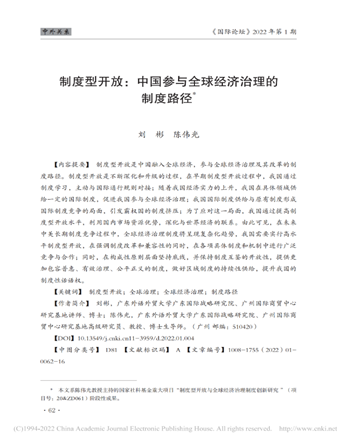2022年1月,我院高级研究员陈伟光教授与刘彬博士合作的文章《制度型开放:中国参与全球经济治理的制度路径》发表于《国际论坛》(二类B)2022年第1期。