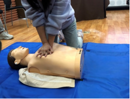 李浩天同学为参会人员讲解了面临火情、地震、恐怖袭击、突遇有人倒地等突发状况时的应对方式,并详细介绍了成人心肺复苏以及AED机使用的方法,并指导现场每一位同学进行心肺复苏以及患者复苏后正确体位的模拟演练。