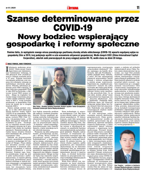 2020年是不平凡的一年,一场突如其来的新型肺炎疫情打乱了全国人民的生活,一场防控阻击战在中国骤然打响。在抗击疫情期间,广东国际战略研究院积极行动,发挥智库优势,从事疫情相关研究,上报各类决策咨询报告100余份。组织学生开展“新型冠状病毒肺炎疫情下中国制造业企业发展现状”专题调查和ESIEC2020疫情专题企业追踪调查,调查疫情对于中小企业的影响;多名研究员和国际客座研究员针对疫情对中国经济和社会多方面的影响,在国内外媒体上刊登多篇文章,积极发声,贡献智慧,其中青年珠江学者韩永辉与西语学院茅银辉教授联合在波兰主流媒体《论坛报》上发表文章,并获人民日报转载。