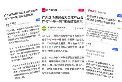 7月10日,在一带一路智库联盟指导下,由广东国际战略研究院、中联部当代世界研究中心主办,大连海事大学一带一路研究院和华侨大学海上丝绸之路研究院协办的“新冠肺炎疫情冲击下的全球产业合作与‘一带一路’建设”专题研讨会在北京、广州两地线上召开。中共中央对外联络部副部长郭业洲、广东省人大常委会副主任罗娟、泰国前国会主席颇钦·蓬拉军、马来西亚前国会下议院副议长翁诗杰、我校党委书记隋广军出席研讨会并致辞,近30位中外政要、官员和知名学者参会发言,共同为疫情后国际产业合作和“一带一路”高质量建设建言献策。此次专题研讨会受到广大媒体的高度关注,人民日报、中央广电总台、中国社会科学网、凤凰网、广东卫视、南方都市报、羊城晚报、潇湘晨报等多家媒体报道。专题研讨会传播力、影响力进一步提升。