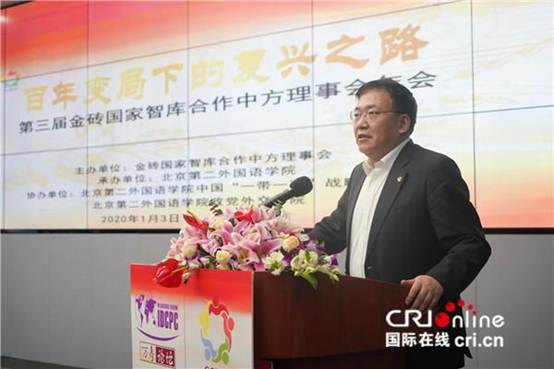 2020年1月3日,由金砖国家智库合作中方理事会(下称“中方理事会”)主办、北京第二外国语学院承办的“第三届金砖国家智库合作中方理事会年会暨第二届万寿国际形势研讨会”在北京成功召开。本次会议以“百年变局下的复兴之路”为主题,来自国内高校、研究机构及企事业单位等近百家理事单位与70余位专家学者共计200余人与会。广东国际战略研究院是金砖国家智库合作中方理事会的理事单位,钟祖昌副秘书长代表研究院参加会议,并在分论坛“新工业革命与人类命运共同体”上发言。