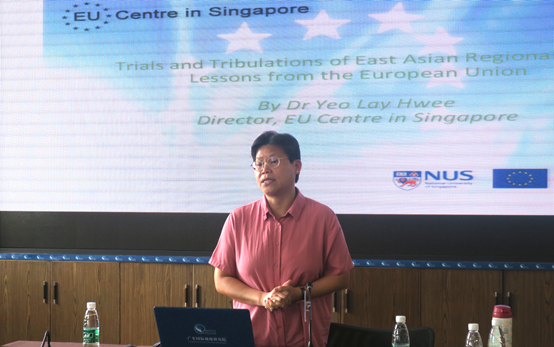 本次讲座上,Yeo Lay Hwee教授首先通过对欧盟这一成功的地区组织的分析,在经济一体化、组织结构等方面将欧盟与目前东亚经济一体化过程中所体现的地区主义进行对比。同时,Yeo教授进一步对区域合作(regional cooperation)、区域一体化(regional integration)和区域共同体(regional community)的区别做出了详细的阐述。
