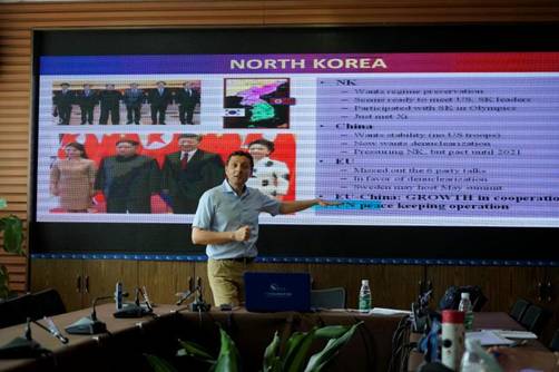 César de Prado博士分别分析了中国和欧洲在实践理论、军事力量、人道主义救援以及核不扩散等几个方面的问题,并预测中欧各方面的安全合作前景,他还介绍了当前欧洲和中印环太平洋安全生态系统的情况。针对比较热门的中国南海问题和朝鲜问题,César de Prado博士认为只有东南亚国家联盟变得强大,联合国维和持续发挥作用,中国和欧盟的合作关系才会加强。