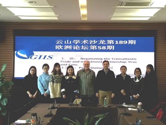 2017年12月21日,云山学术沙龙第189期、欧洲论坛第58期在广东国际战略研究院304会议室举行,主讲嘉宾是Peter Steiner教授,讲座的题目是Negotiating the Transatlantic Trade and Investment Partnership: Prosand Cons。凯撒副教授和欧洲学师生参加讲座。讲座由欧洲研究中心赖雪仪博士主持。