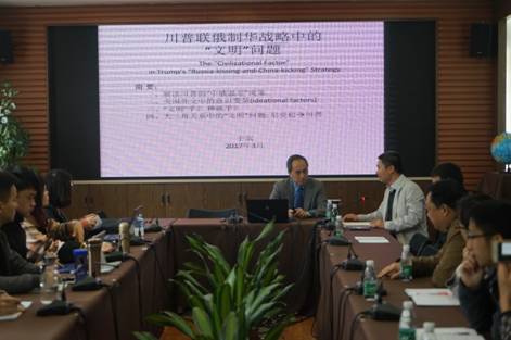 2017年3月8日,云山学术沙龙第164期在国际战略研究院304会议室举行。本期学术沙龙主讲嘉宾是美国Wittenberg大学政治学教授、上海美国学会资深研究员于滨,主题为“川普联俄制华战略中的‘文明’问题”。讲座由中国周边战略研究中心主任周方银教授主持。副秘书长陈寒溪、研究院研究员及师生参加讲座。
