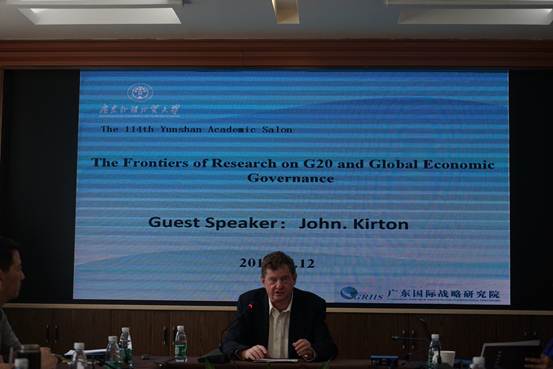 Kirton教授的演讲从G20的产生背景,当前国际形势下的发展状况以及未来愿景三个方面延伸讨论全球经济治理战略。G20是一个国际经济合作论坛,于1999年9月25日由八国集团(G8)的财长在华盛顿宣布成立,属于布雷顿森林体系框架内非正式对话的一种机制,由原八国集团以及其余12个重要经济体组成。宗旨是为推动已工业化的发达国家和新兴市场国家之间就实质性问题进行开放及有建设性的讨论和研究,以寻求合作并促进国际金融稳定和经济的持续增长。按照以往惯例,国际货币基金组织与世界银行列席该组织的会议。20国集团成员涵盖面广,代表性强,该集团的GDP占全球经济的90%,贸易额占全球的80%,已取代G8成为全球经济合作的主要论坛。