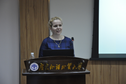 2016年3月31日,云山学术沙龙第106期讲座“当前中俄合作问题:俄罗斯视角”在六教B415举行。本次讲座的主讲人是目前在广外攻读博士后的俄罗斯学者金凤花博士。讲座由欧洲研究中心主任陈寒溪教授主持。留学生教育学院院长梁学宏教授、法学院副院长王树春教授、俄语专业博士生、欧洲学专业研究生参加了讲座。