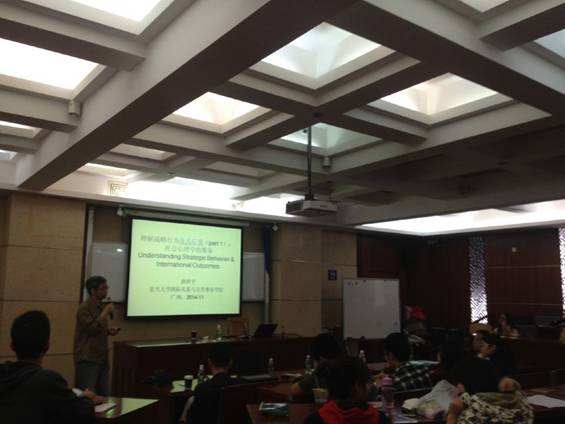 2014年11月7日上午,复旦大学国际关系与公共事务学院唐世平教授莅临广外进行学术交流,并做了主题为“理解战略行为及其后果”的精彩演讲。广东国际战略研究院欧洲研究中心主任陈寒溪教授主持了讲座,广东国际战略研究院和法学院的部分师生参加。