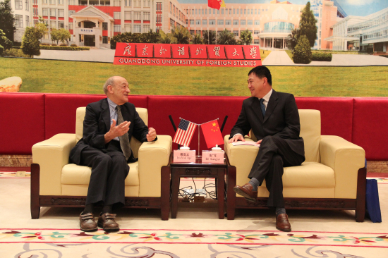 在此前与隋广军的会谈中,傅高义对我校的国际化特色有了一定的了解。因而,在谈到开放问题时,他特别强调:“广东要继续开放,你们学校有很多工作可以做。”他说道,广外能培养精通外语、了解外国情况的高质量人才,这对广东的发展而言非常重要。