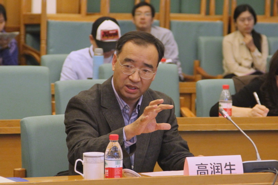 高润生更是别出心裁地用一副以“顶天立地树人、求真求实求高”为上下联,以“协同创新”为横批的对联表达自己的看法:“顶天”表示要依托重大理论,“立地”则是提示创新团队要关注现实问题,“树人”即要加强培养领军人物。他对专家的意见进行了补充强调,要求团队在今后的计划中进一步凝炼重大课题、加强顶尖人才和拔尖人才的培养、依托平台建设,协同其他高校,加强深层次高水平的国际合作、把“努力建设成有特色、高水平、有国际影响的智库”作为长期的奋斗目标。
