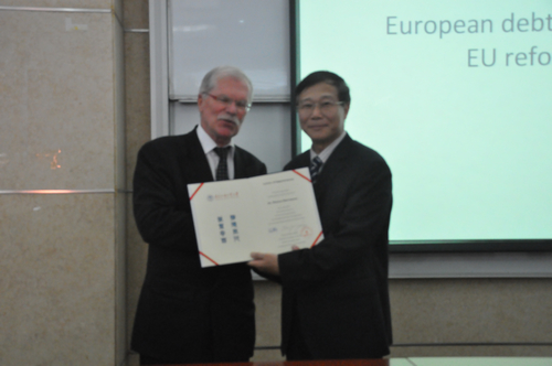 2012年5月9日是第62个“欧洲日”,也是中欧建交37周年的纪念日。在这一天,欧盟前对外事务首席顾问、前驻中国与蒙古大使、前驻埃及和阿拉伯联盟大使安高胜博士(Dr. Klause Ebermann)受聘欧洲研究中心首位学术顾问,并在“欧洲论坛”主讲题为“欧债危机与欧盟治理改革”的讲座。活动在北校六教B103室举行。校党委副书记、欧洲研究中心学术委员会主席陈建平,广东国际战略研究院秘书长李青、国际合作交流处副处长梁洁、欧洲研究中心主任蔡红以及欧洲学硕导、欧盟让莫内课程项目主持人王小海以及全体欧洲学硕士研究生与部分法律硕士研究生见证了受聘仪式。