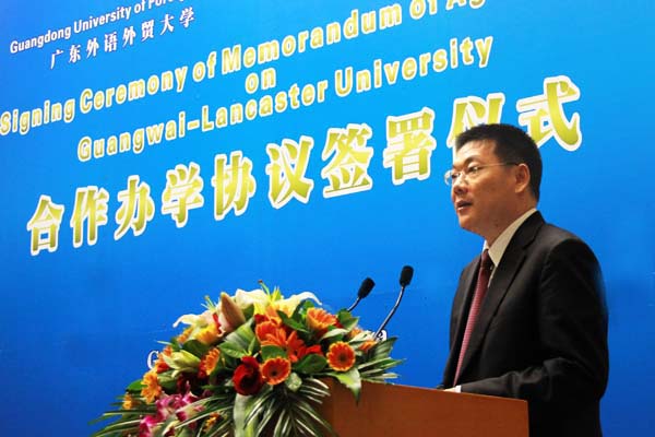 鲍尔•威林斯表示签约仪式是两校合作的历史性时刻。广外与兰卡斯特大学一直有着密切的联系,合作内涵非常丰富,如多次互派教师考察,创办国际班等,这些合作促进了两校合作办学协议的达成。兰卡斯特大学已经成为英国最强的十所大学之一,同时跻身世界100强大学。兰卡斯特大学本着“互惠、培养高质量人才和为世界、地方乃至区域带去积极影响”的原则积极寻求拓展国际合作的机会,与中国高等院校合作始于1976年,并与北京大学、北京外国语大学、上海交通大学、中山大学和广东外语外贸大学都有合作关系。在国际化趋势下,兰卡斯特大学和广外一致认同应该加强联系,强化纽带,共同面对世界问题。两校合作办学是一个巨大发展机遇,将有利于实现合作目标,创造更多机会。
