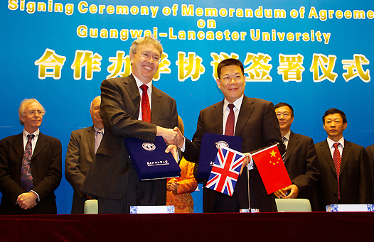 10月26日上午,“广外-兰卡斯特大学”合作办学协议签署仪式在我校北校区国际会议厅举行。我校校长仲伟合与英国兰卡斯特大学校长鲍尔•威林斯签署了合作办学协议,标志着广东首家中英合办高校“广外-兰卡斯特大学”迈出里程碑的一步。
