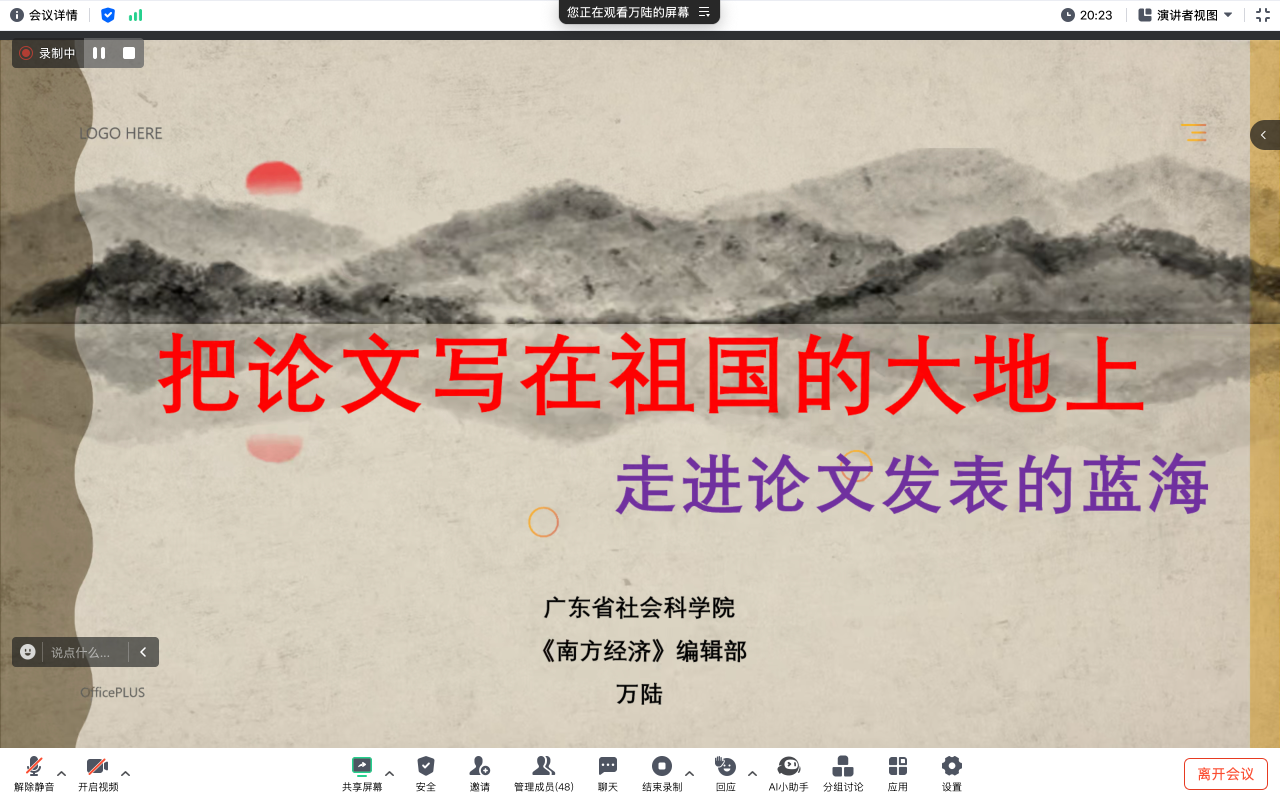 《南方经济》执行主编万陆老师以“把论文写在祖国的大地上——走进论文发表的蓝海”为题开展讲座。他在讲座上指出讲好经济学故事,本质上是用经济学的理论、逻辑、证据,告诉其他学者一些有启发性的新知识、新观点和新视角。