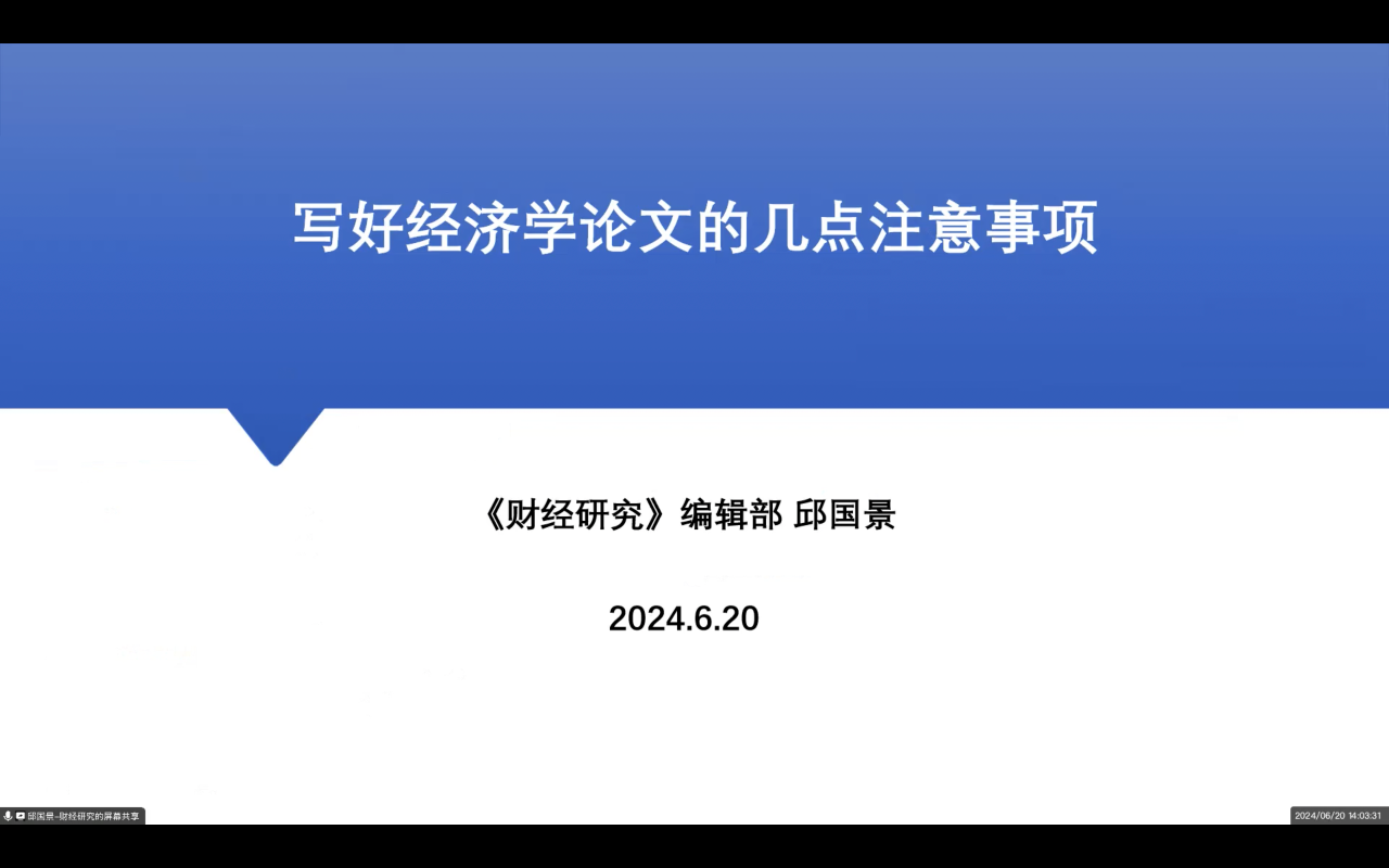《财经研究》编辑部副主任邱国景老师以“写好经济学论文的几点注意事项”为题开展讲座。他在讲座上为大家详细介绍了选题的把握,摘要、引言和结论的撰写,机制分析和异质性分析的开展,审稿意见的回复等具体流程和需要注意的事项。