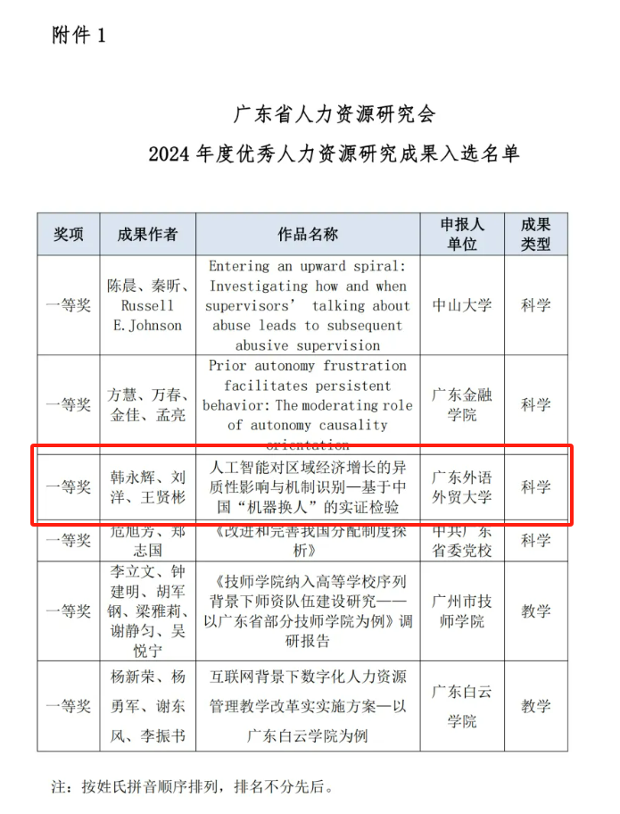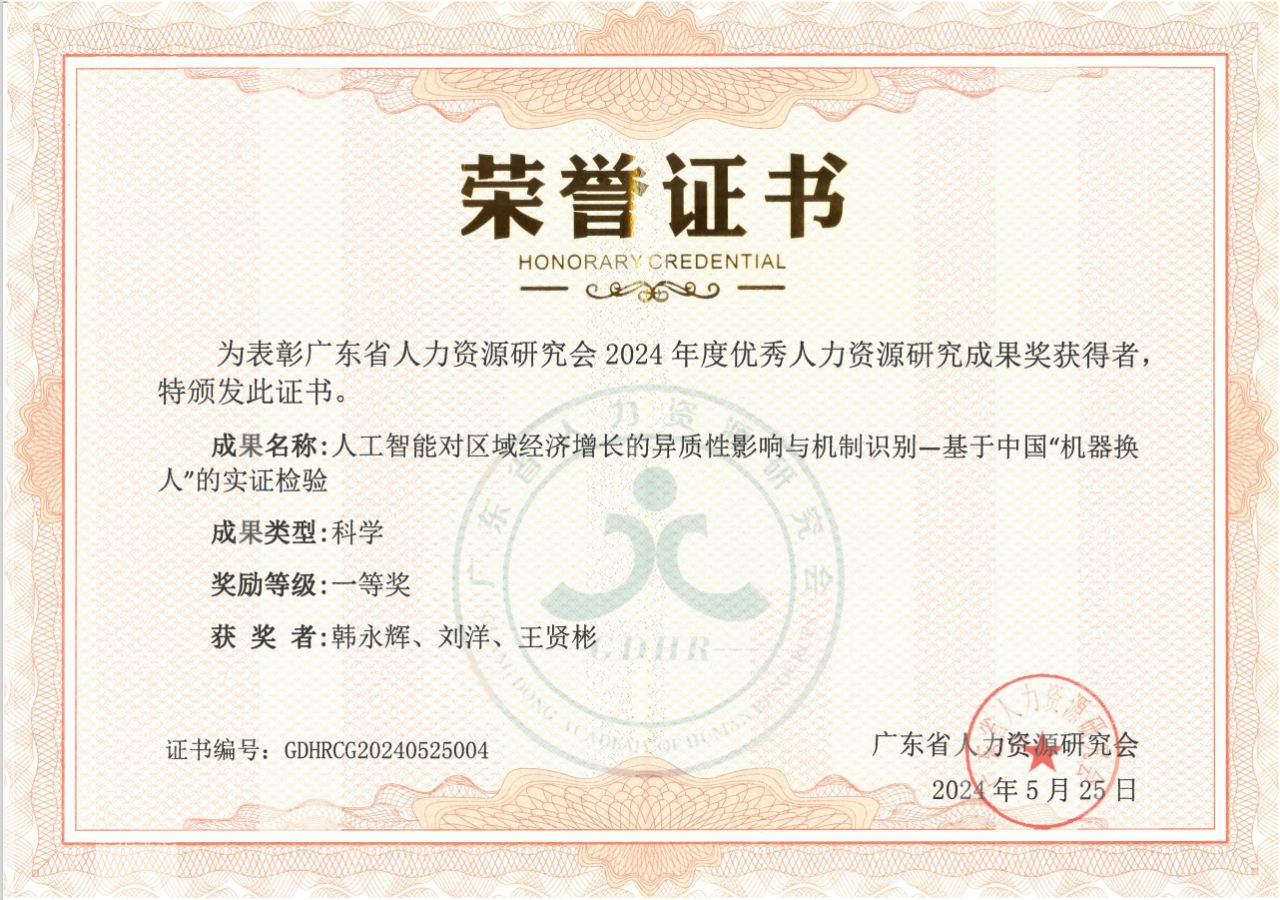 近期,广东省人力资源研究会对2024年度优秀人力资源研究成果入选名单进行公示,我院韩永辉教授、刘洋博士的研究成果论文荣获一等奖,论文题目为:《人工智能对区域经济增长的异质性影响与机制识别一基于中国“机器换人”的实证检验》。该论文的其他作者还包括:王贤彬(暨南大学经济学院副教授)。