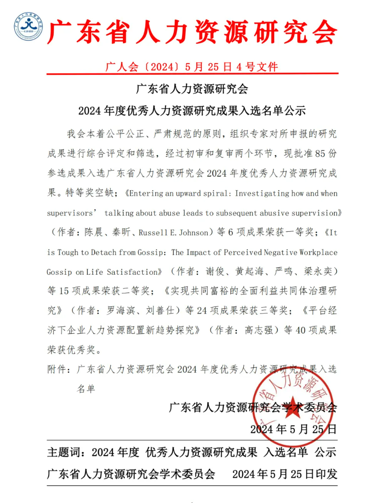 据了解,广东省人力资源研究会是2013年经广东省民政厅批复成立的全省性4A级社会组织,基于产学研合作,致力于推动广东省人力资源管理与服务的转型升级。优秀人力资源研究成果奖是由广东省人力资源研究会主办设立,奖项分为科学、教学两大类。经过专家通讯评审推荐与学术委员会的严格审核批准,2024年度优秀人力资源研究成果奖共有85份参选作品获奖,其中一等奖6份、二等奖15份、三等奖24份、优秀奖40份。