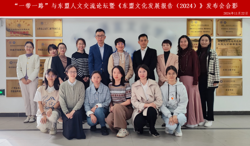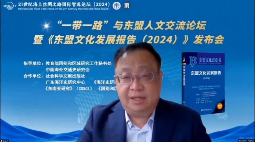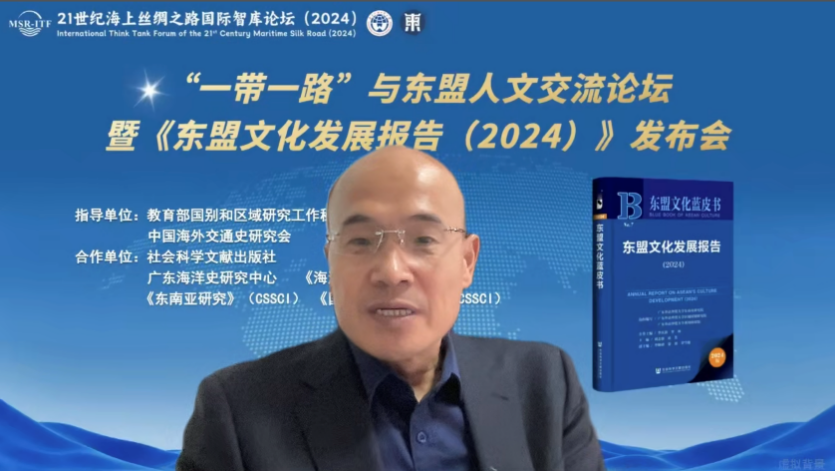 2024年11月22日,21世纪海上丝绸之路国际智库论坛(2024)在广州举行。本届论坛由“一带一路”智库合作联盟指导,中共中央对外联络部当代世界研究中心、广东公共外交协会、广东外语外贸大学和广东国际战略研究院共同主办。论坛主题为“新质生产力与‘一带一路’高质量发展”,吸引了来自“一带一路”沿线国家的智库领袖、知名学者、政府官员、企业家、驻穗总领事及驻穗商会代表等与会。由广东外语外贸大学东南亚学院(东南亚研究院)、教育部国别和区域研究中心——中南半岛研究中心承办的“一带一路”与东盟人文交流论坛暨《东盟文化发展报告(2024)》发布会以线上和线下结合的方式成功举行。本次论坛还得到教育部国别和区域研究工作秘书处、中国海外交通史研究会的指导,以及社会科学文献出版社、广东海洋史研究中心、《海洋史研究》(CSSCI)、《东南亚研究》(CSSCI)、《国别和区域研究》(CSSCI)等单位的大力支持。