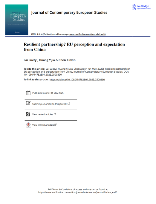 我院欧洲研究中心副教授赖雪仪(Lai Suetyi)、本科生陈欣欣(Chen Xinxin)和新加坡国立大学亚洲竞争力研究所黄一嘉(Huang Yijia)合著的文章“Resilient partnership? EU perception and expectation from China”发表于Journal of Contemporary European Studies(SSCI, 二类A)。