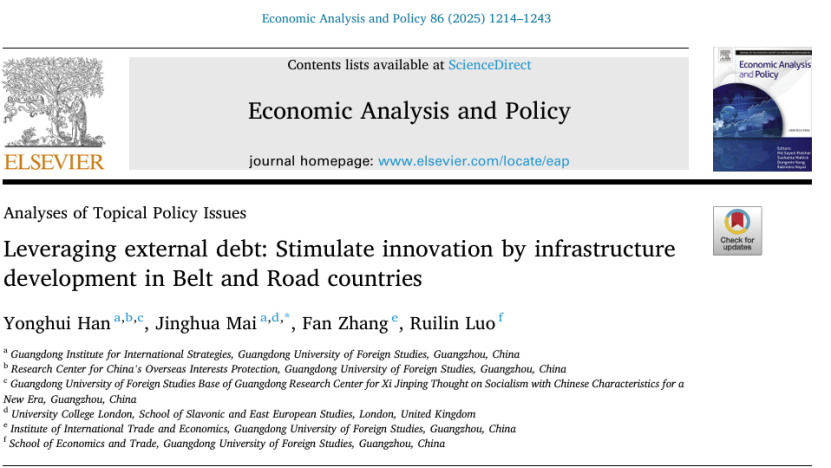 我院教授韩永辉、博士生麦靖华等人合著的文章“Leveraging external debt: Stimulate innovation by infrastructure development in Belt and Road countries”发表于《Economic Analysis and Policy》(SSCI, 二类A)。