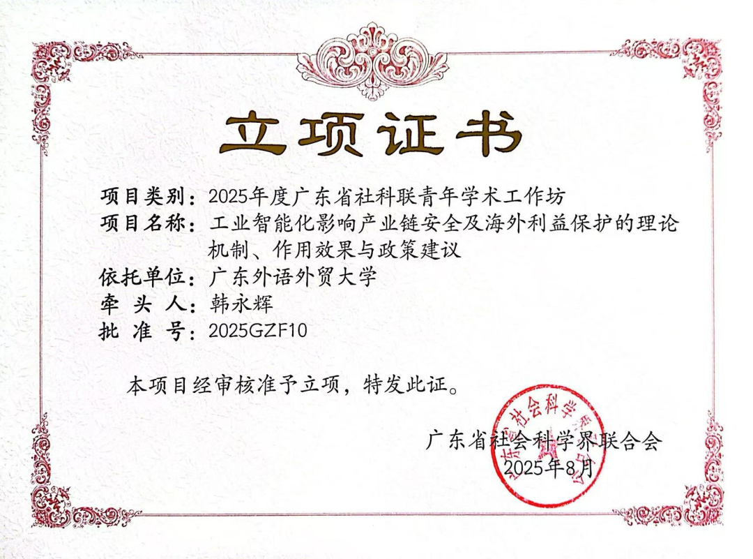 8月22日,2025年度广东省社科联青年学术工作坊开营仪式顺利举行。仪式上,我院韩永辉教授牵头申报的课题《工业智能化影响产业链安全及海外利益保护的理论机制、作用效果与政策建议》成功获得首届工作坊立项。