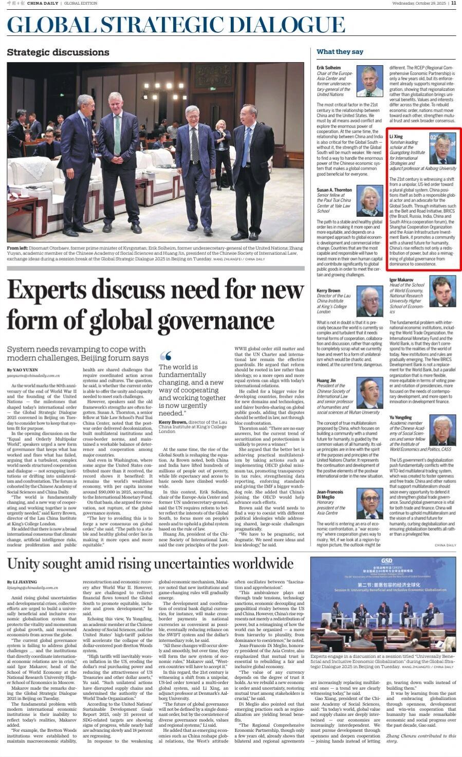 2025年10月28日,我院云山领军学者、欧洲研究中心主任、丹麦奥尔堡大学兼职教授李形受邀赴北京,参加由中国社会科学院与中国日报社联合主办的“全球战略对话(2025)”智库论坛。中国社会科学院院长高翔,中国日报社社长兼总编辑曲莹璞,吉尔吉斯斯坦前总理卓奥玛尔特·奥托尔巴耶夫,欧盟亚洲中心主席、联合国前副秘书长埃里克·索尔海姆出席开幕式并致辞。