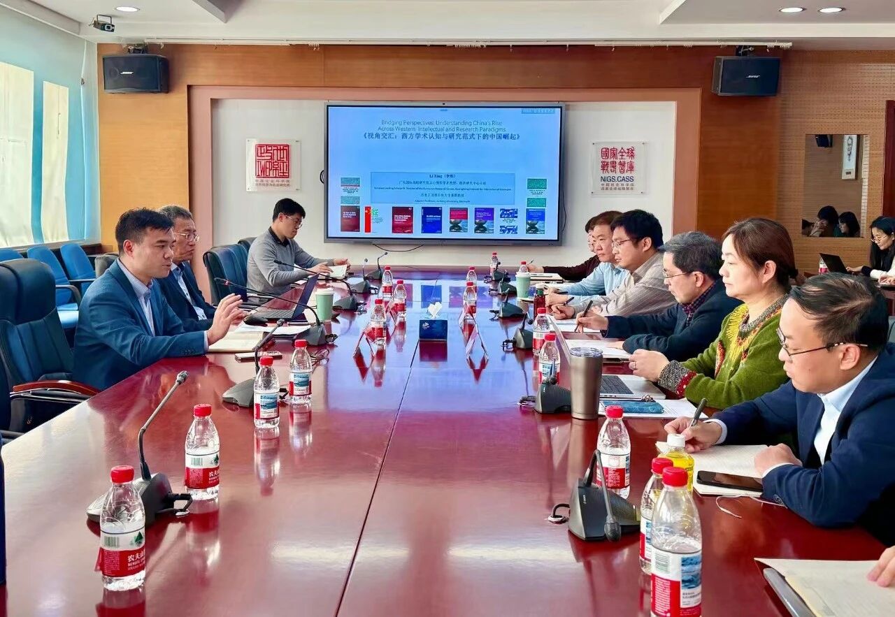 12月11日,调研团队一行走访中国社会科学院世界经济与政治研究所,与世经政所党委书记、所长廖凡研究员、全球治理研究室副主任陈兆源副研究员和外交政策研究室副主任彭博进行座谈交流,双方深入探讨了中美博弈、全球治理体系变革和大国外交等前沿问题,并表示将继续共同打造全球经济治理学术论坛这一品牌学术活动。调研团走访期间,李形教授以“视角交汇:西方学术认知与研究范式下的中国崛起”为题在“世经政讲坛”上做主题报告,并与参会学者就中欧关系、全球治理、“一带一路”倡议等议题进行了深入交流。
