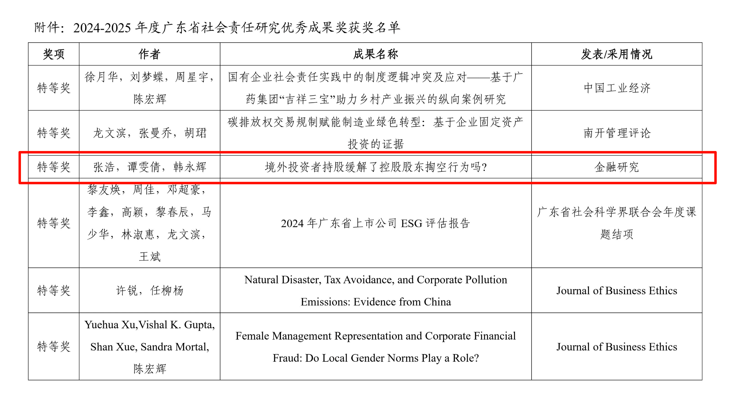 近日,广东省社会责任研究会依据《年度广东省社会责任研究优秀成果奖评审办法》,组织开展了2024-2025年度优秀成果评审工作。经严格评审,我院执行院长韩永辉教授与广东外语外贸大学金融学院张浩教授、中山大学国际金融学院谭雯倩博士研究生合作完成的学术论文《境外投资者持股缓解了控股股东掏空行为吗?》在众多参评成果中脱颖而出,荣获本年度“广东省社会责任研究优秀成果奖特等奖”。