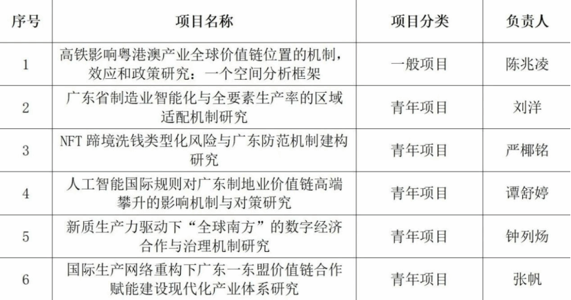 二月,广东省哲学社会科学规划领导小组正式公布了2026年度广东省哲学社会科学规划项目立项名单。我院在此次评审中取得优异成绩,陈兆凌、刘洋和严椰铭3位老师申报的课题获得立项资助,另有张帆、钟列炀和谭舒婷等3位研究院毕业的博士生同时获得立项,涵盖了全球经济治理、数字经济、区域国别研究等多个研究方向。