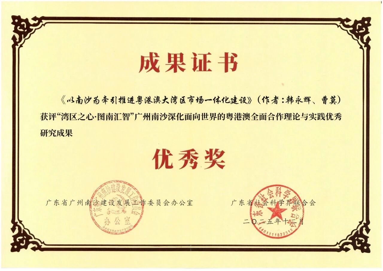 我院执行院长韩永辉教授与我院硕士研究生曹莫合著的文章《制度型开放视域下南沙牵引粤港澳大湾区市场一体化的战略路径研究》发表于《新经济》,该文获评广东省社会科学界联合会“湾区之心·图南汇智”征文优秀成果奖。