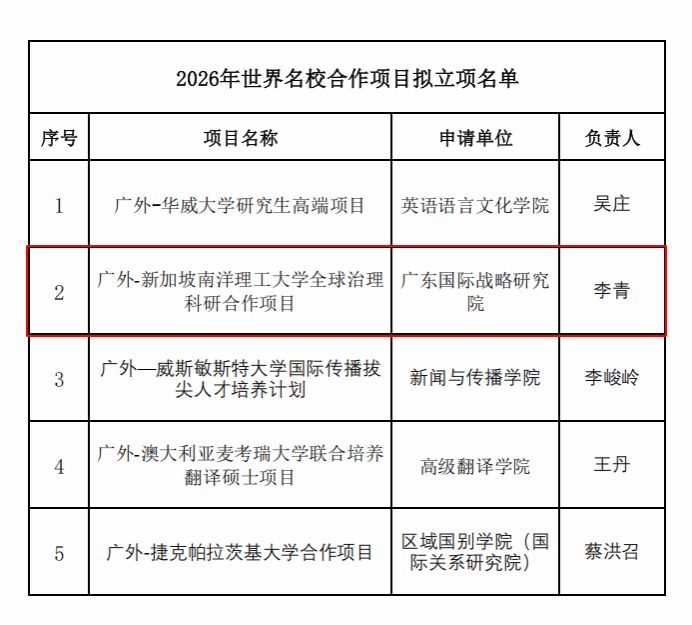 近期,在大学积极推进国际化合作与交流的背景下,我院申报的“广外-新加坡南洋理工大学全球治理科研合作项目”获2026年“世界名校合作项目”立项。该项目将促进我校与新加坡南洋理工大学在教学、科研领域的深入合作,引进先进的教学理念和科研经验,提升人才培养和科研水平。本项目将为我校国际化战略的实施提供有力支持。