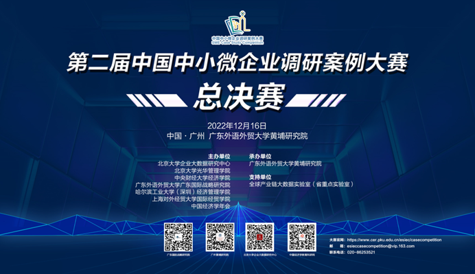 由中国企业创新创业调查(ESIEC)项目院校联盟(北京大学、中央财经大学、哈尔滨工业大学(深圳)、广东外语外贸大学、上海对外经贸大学)联合中国经济学年会共同举办,广东外语外贸大学黄埔研究院、广东国际战略研究院承办的第二届中国中小微企业调研案例大赛总决赛,将于12月16日下午14:00在哔哩哔哩正式打响!