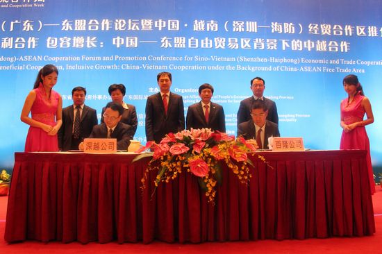 据了解,深圳市政府为贯彻落实国家“走出去”战略在越南设立中国越南(深圳-海防)经济贸易合作区,合作区定位为深圳传统优势产业在越南的产业集聚中心与制造基地。在经贸合作区宣传片播放完毕后,深圳市经济贸易和信息化委员会副主任高林致辞。他说到,深圳市相关职能部门将努力为合作区提供服务与支持。深越公司招商部经理金维华从越南投资环境、海防投资环境以及交通物流环境三大方面简要介绍合作区项目规划和总体建设情况。深越公司和百隆东方股份有限公司于会上举行签约仪式。