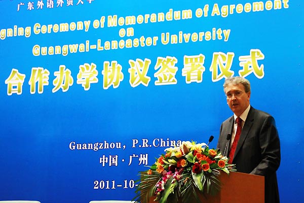 鲍尔•威林斯表示签约仪式是两校合作的历史性时刻。广外与兰卡斯特大学一直有着密切的联系,合作内涵非常丰富,如多次互派教师考察,创办国际班等,这些合作促进了两校合作办学协议的达成。兰卡斯特大学已经成为英国最强的十所大学之一,同时跻身世界100强大学。兰卡斯特大学本着“互惠、培养高质量人才和为世界、地方乃至区域带去积极影响”的原则积极寻求拓展国际合作的机会,与中国高等院校合作始于1976年,并与北京大学、北京外国语大学、上海交通大学、中山大学和广东外语外贸大学都有合作关系。在国际化趋势下,兰卡斯特大学和广外一致认同应该加强联系,强化纽带,共同面对世界问题。两校合作办学是一个巨大发展机遇,将有利于实现合作目标,创造更多机会。